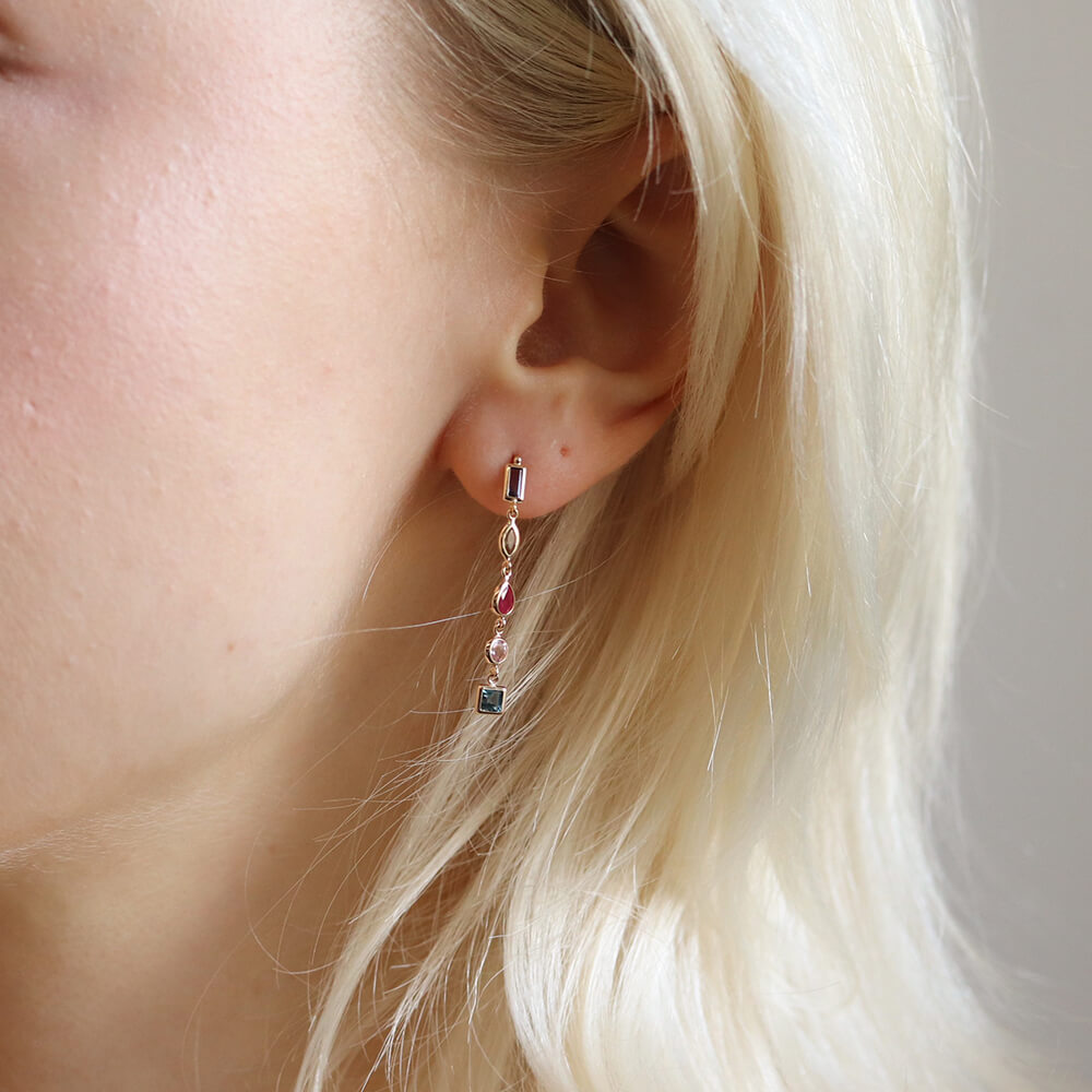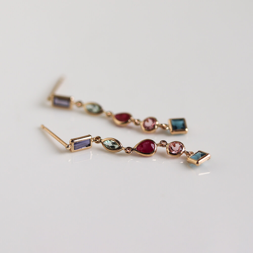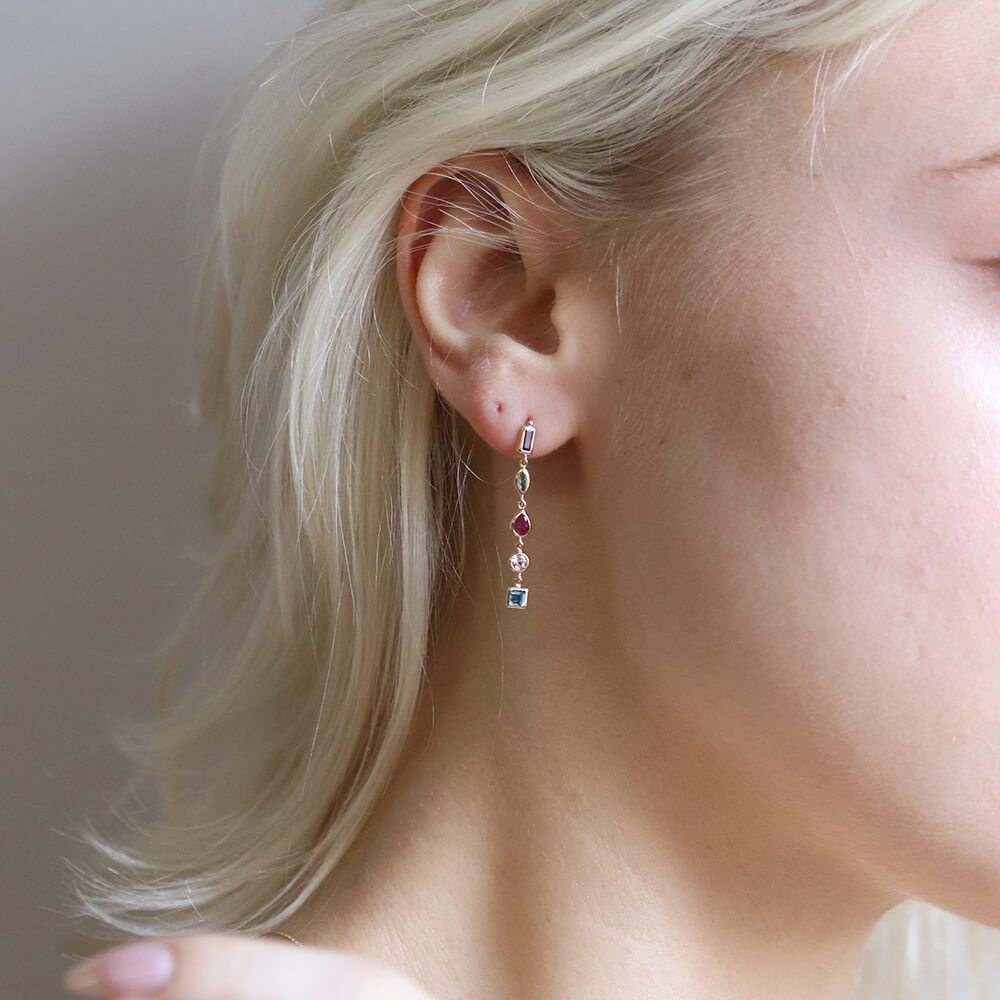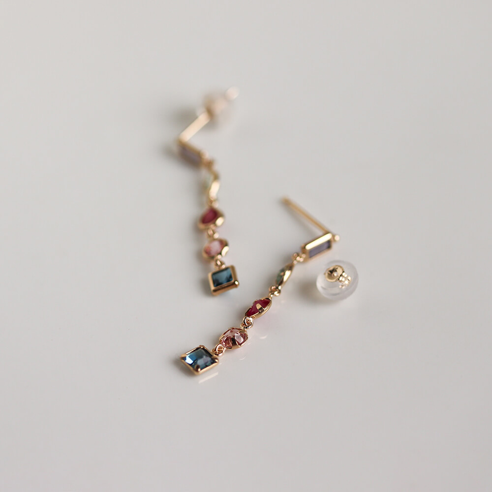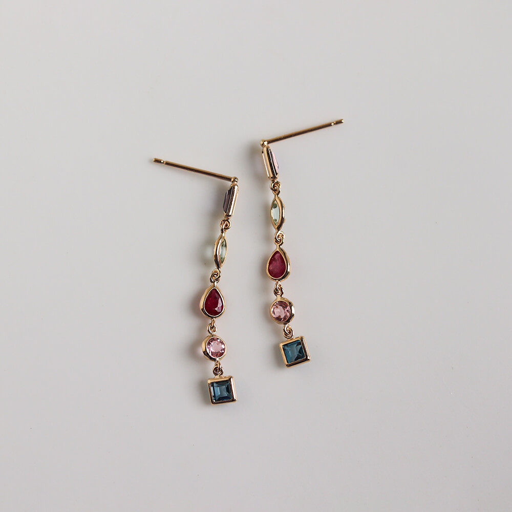 カットもカラーも異なる天然石5石を組み合わせた、アシンメトリーな美しさが魅力のマルチカラーストーンピアス。