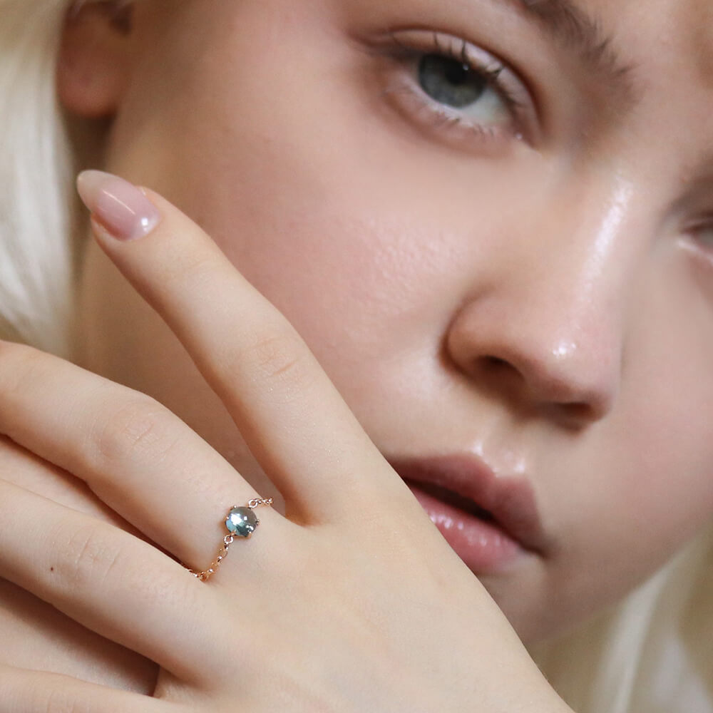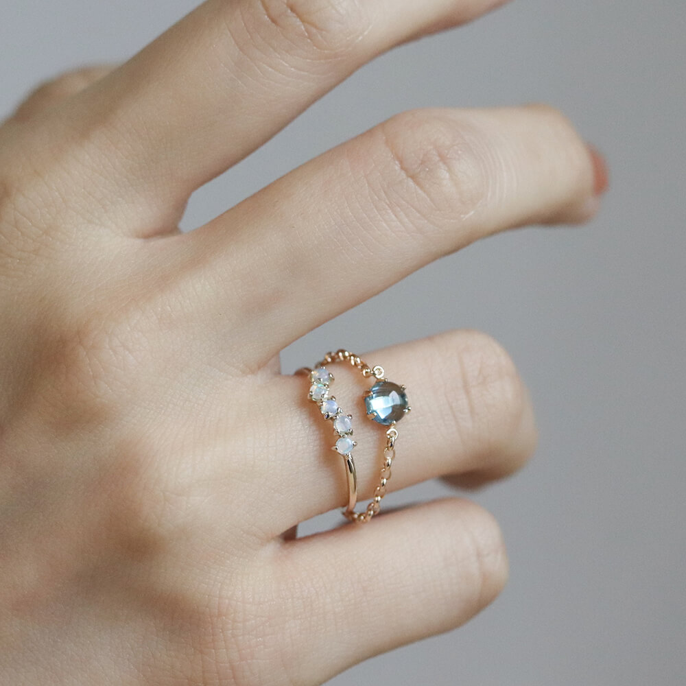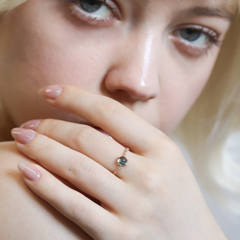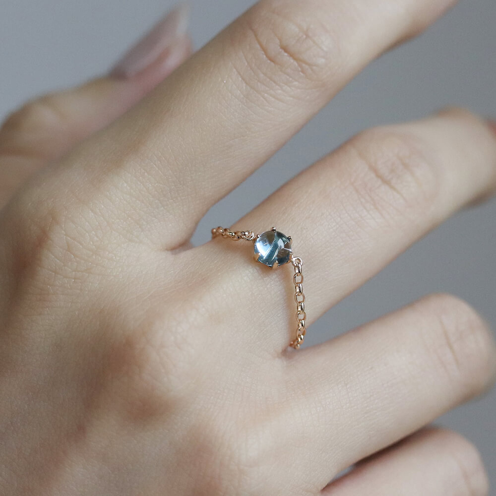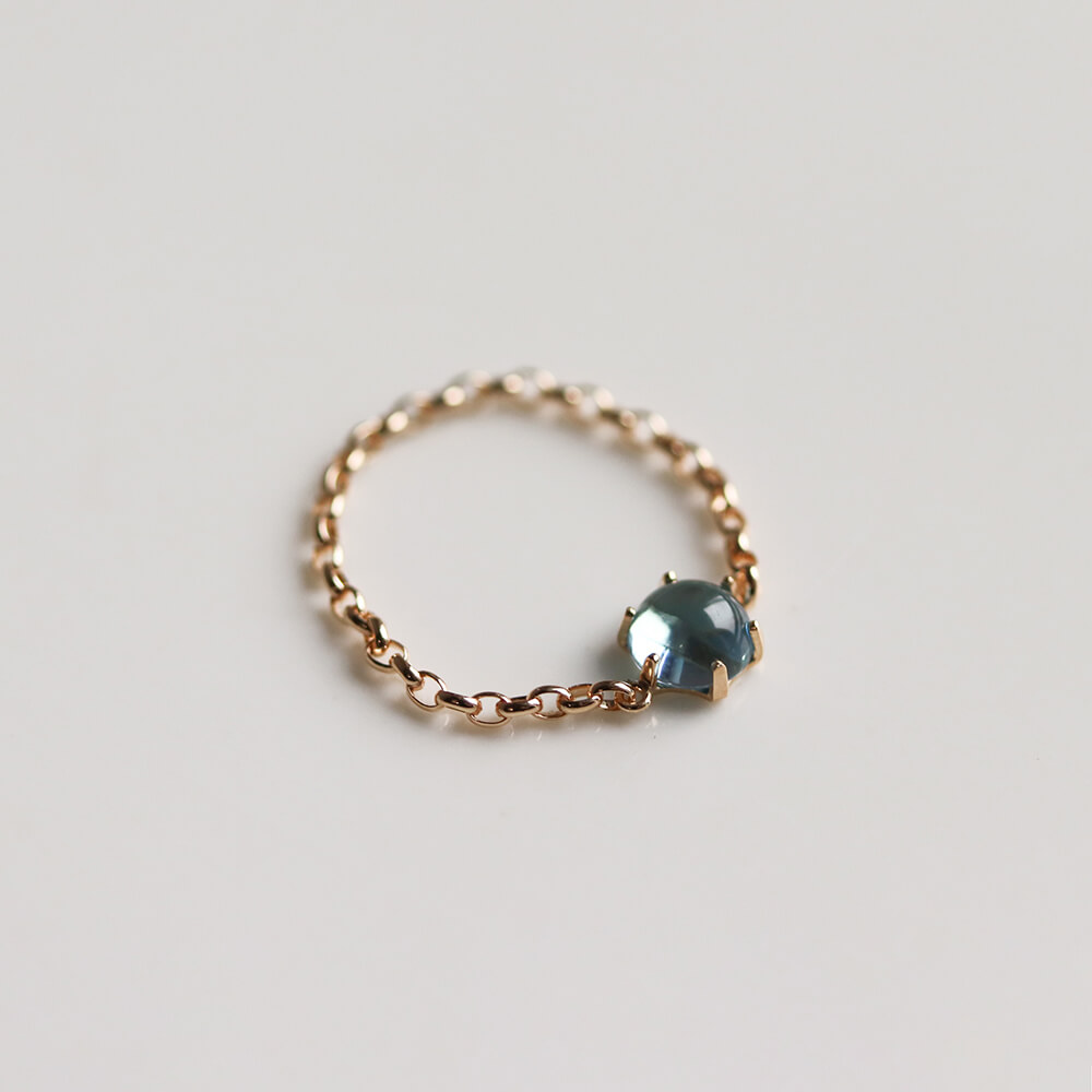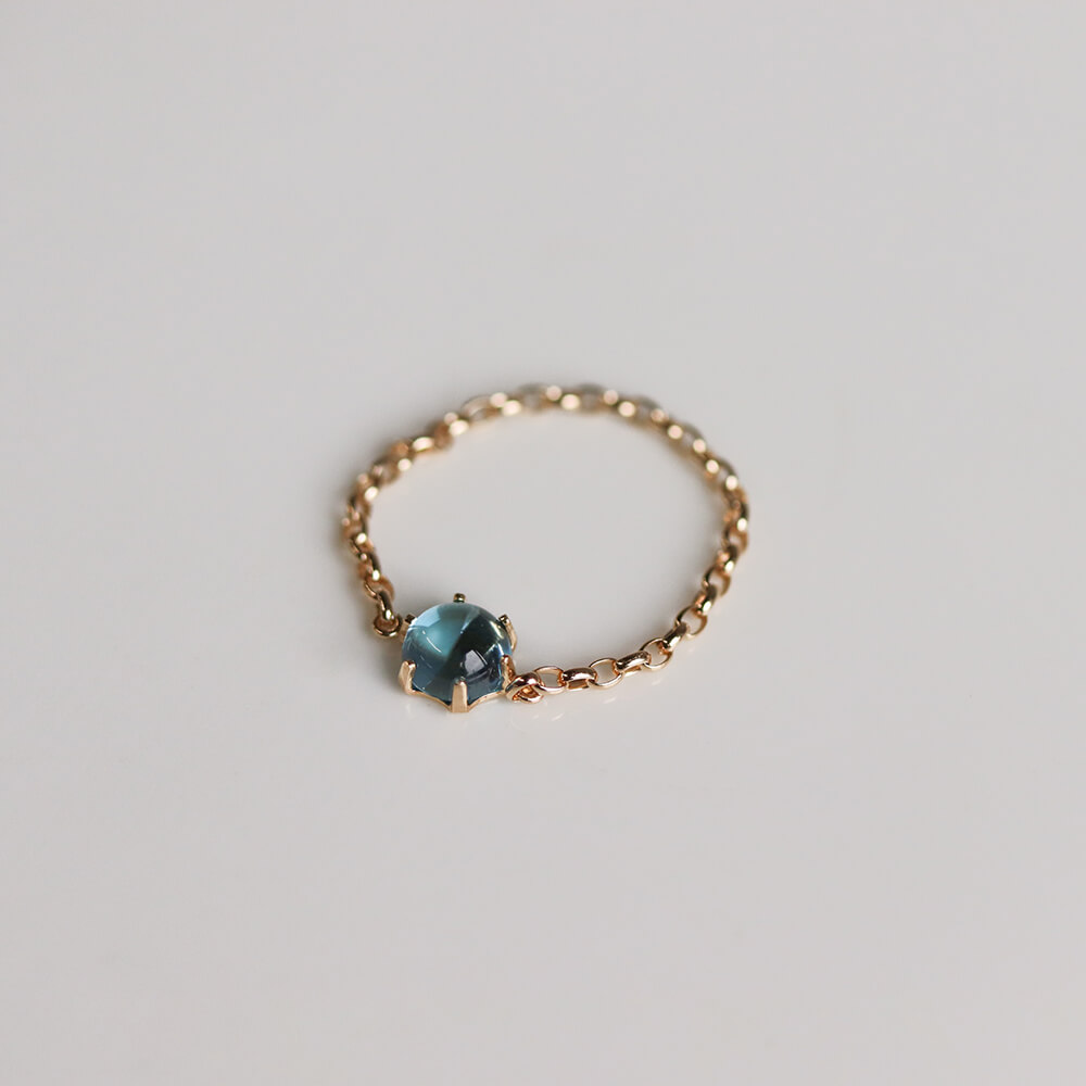 カボションカットのブルートパーズが、艶やかに指先を彩るチェーンリング。