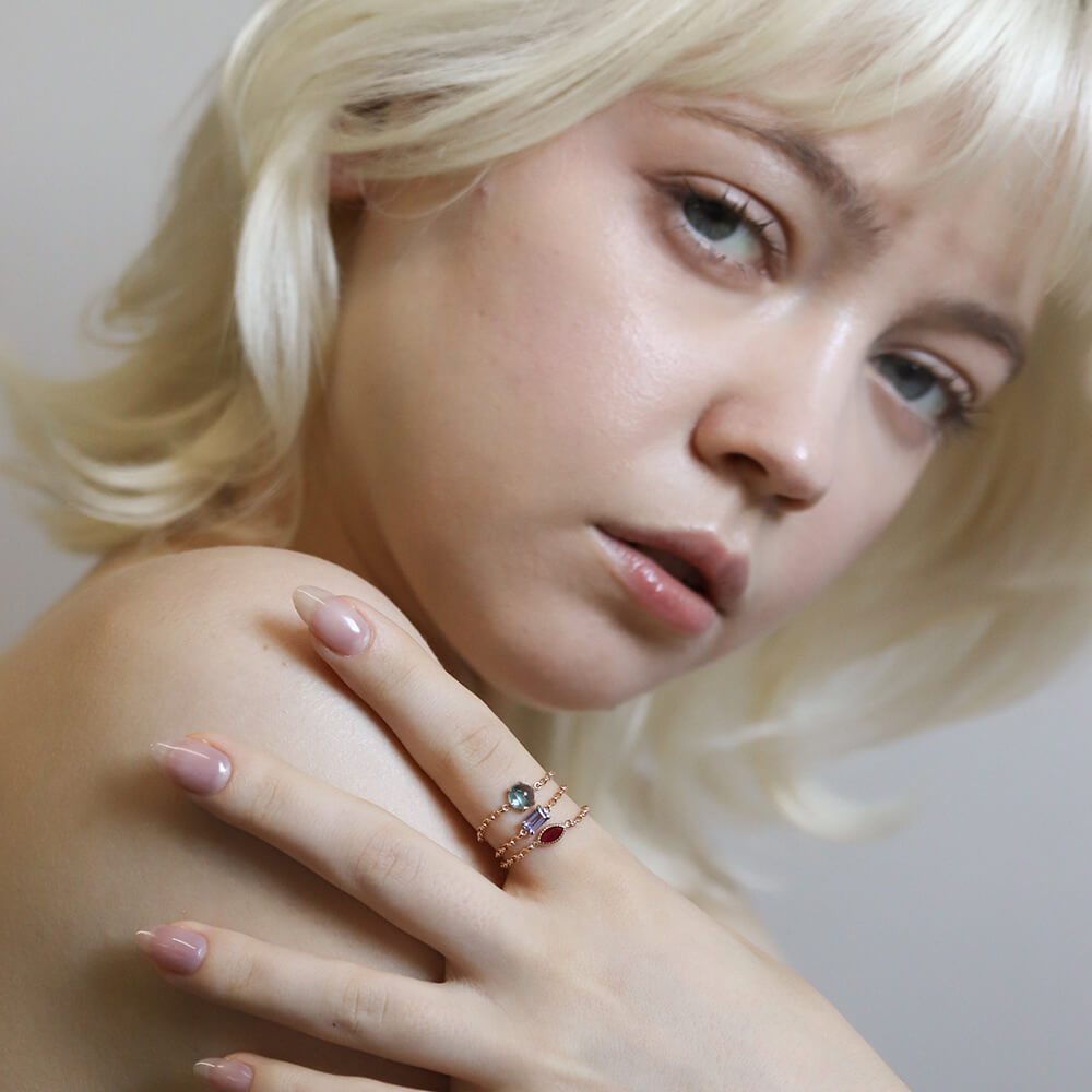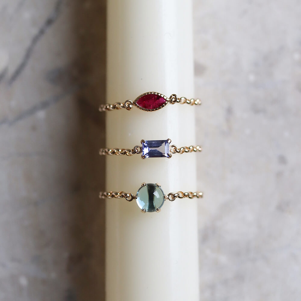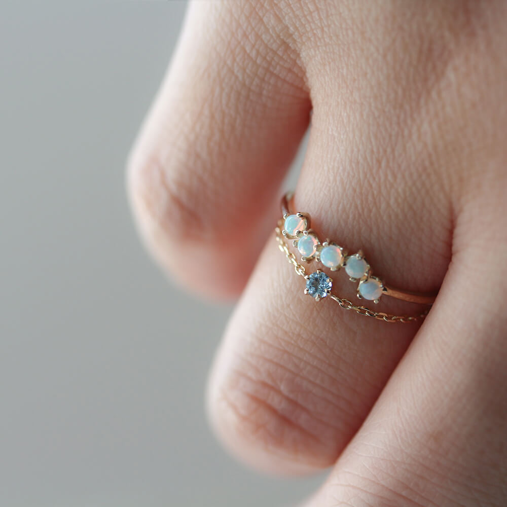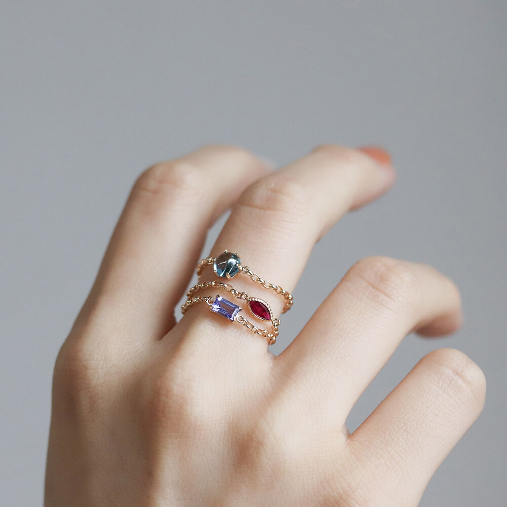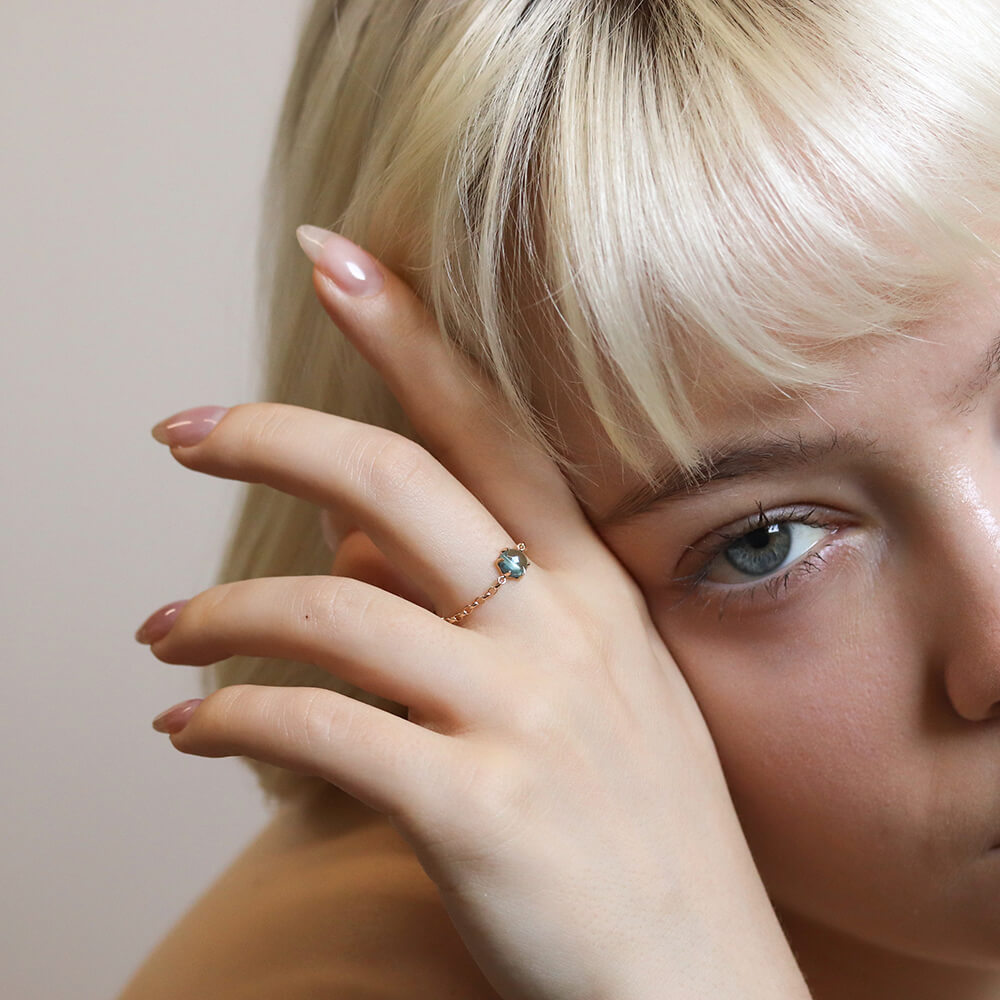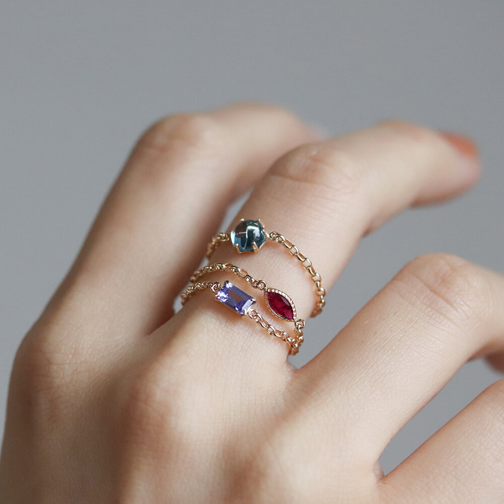 カボションカットのブルートパーズが、艶やかに指先を彩るチェーンリング。