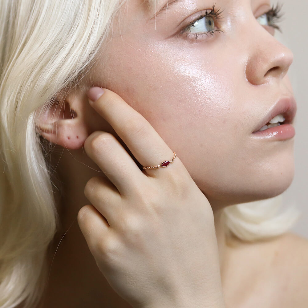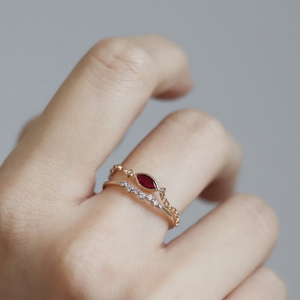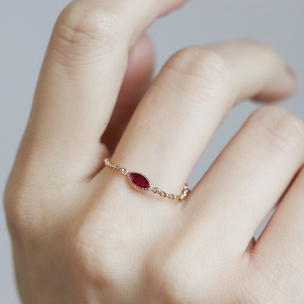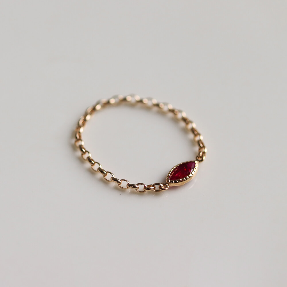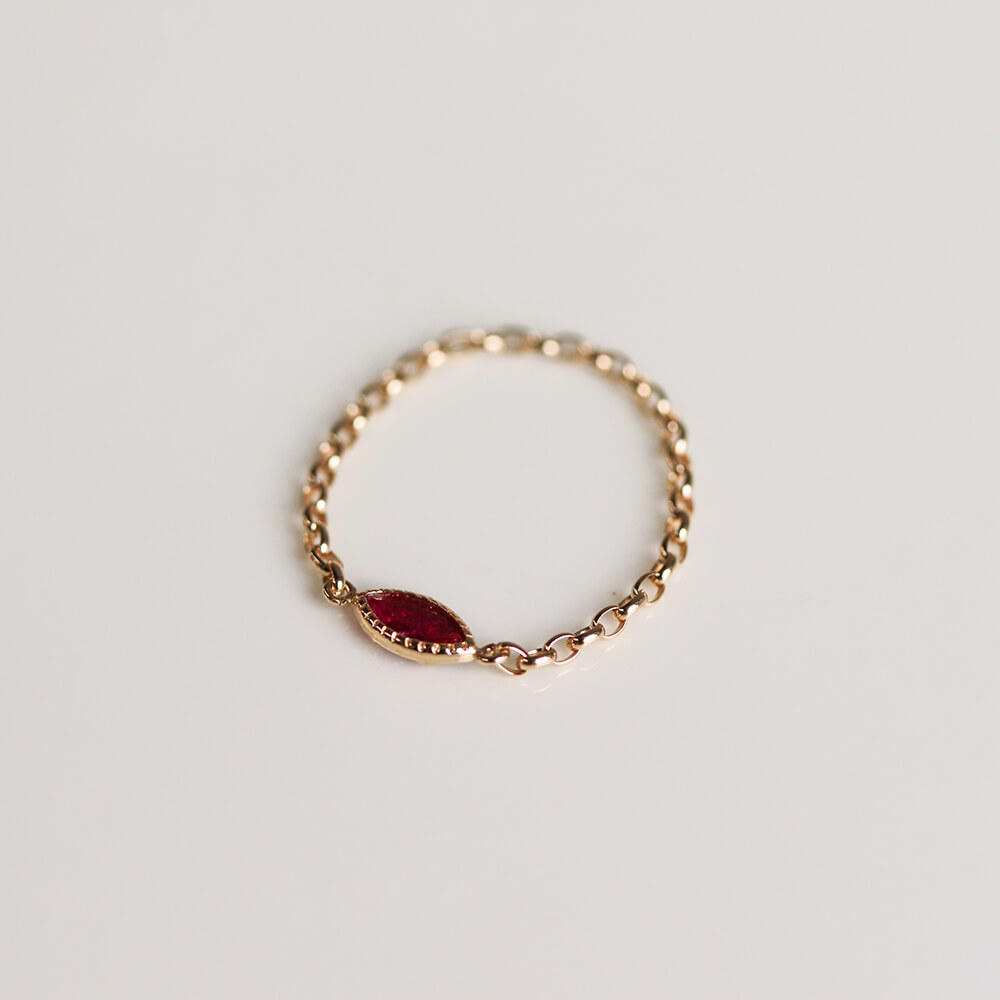 マーキスカットのルビーがさりげなく輝くチェーンリング。