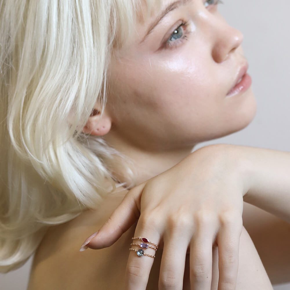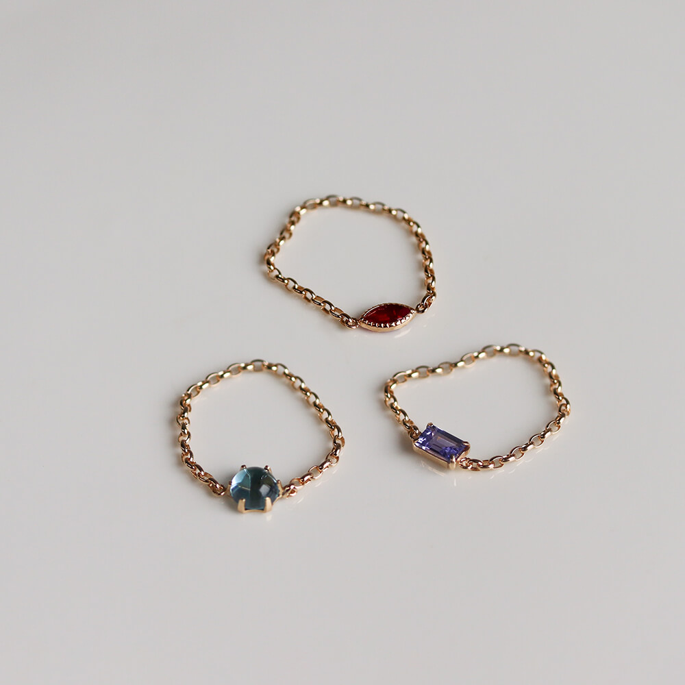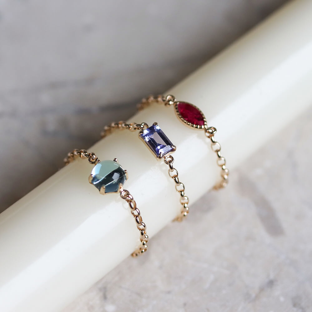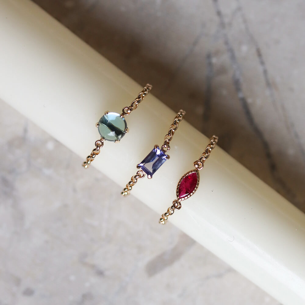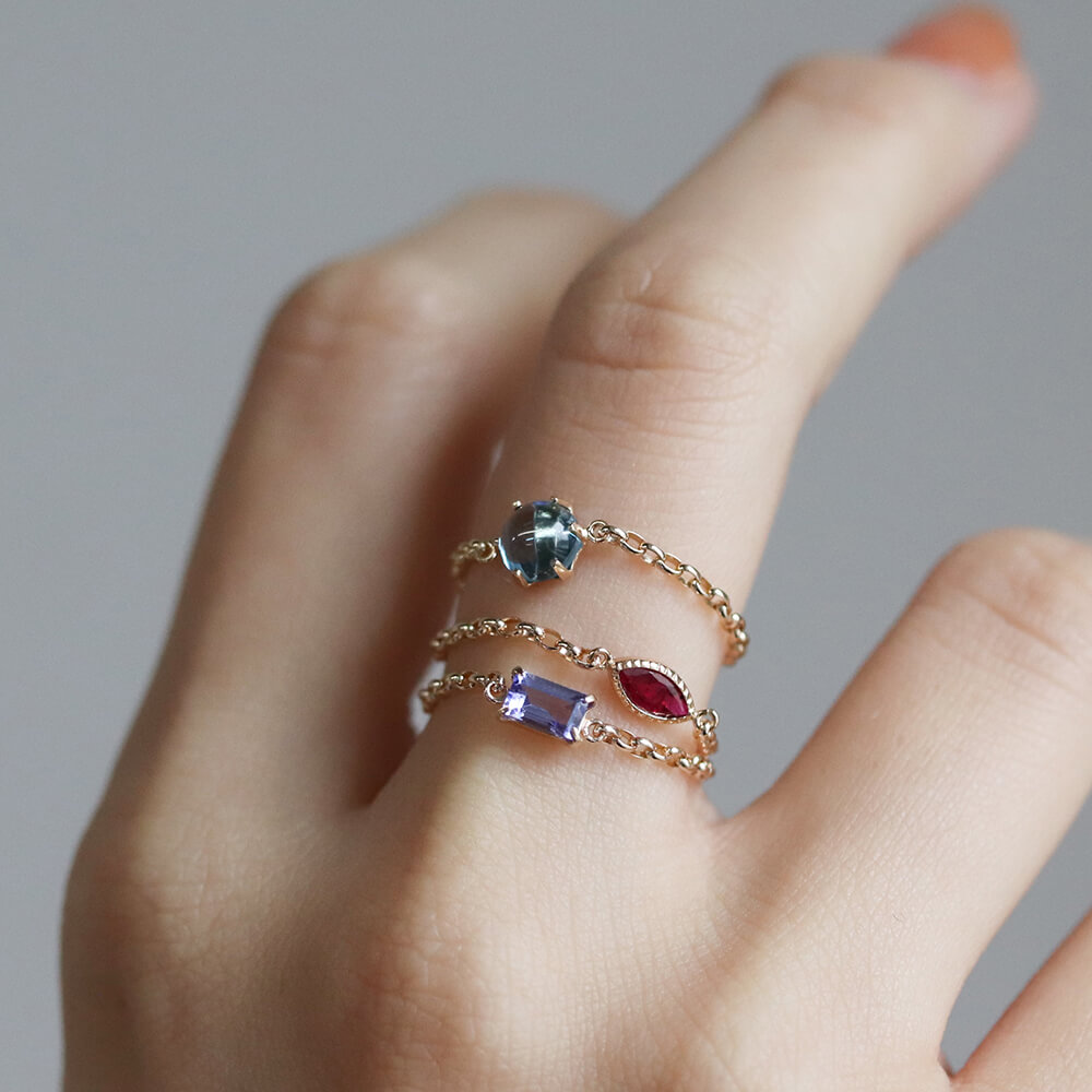 マーキスカットのルビーがさりげなく輝くチェーンリング。