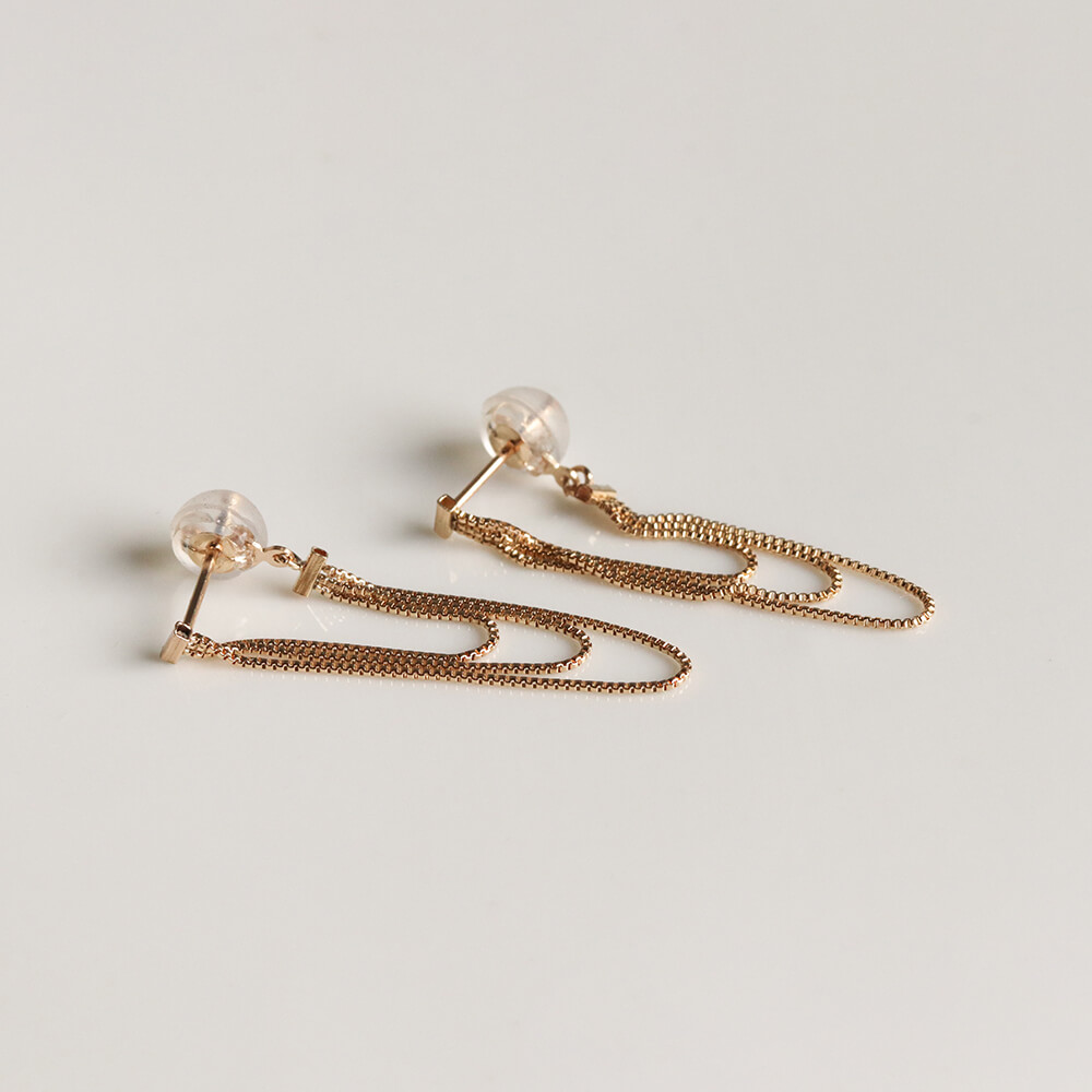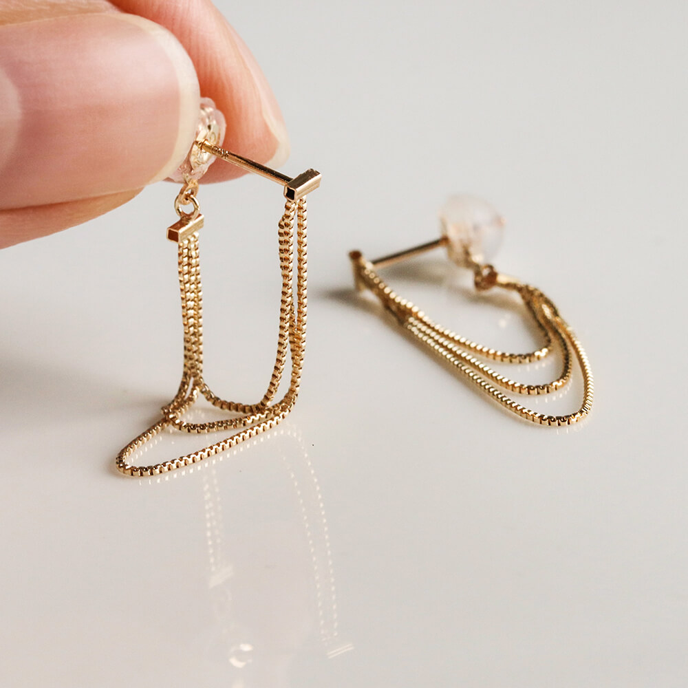長さの異なる繊細なチェーンは動きに合わせてさりげなく揺れ、光をきれいに反射して耳元を明るく見せてくれます。