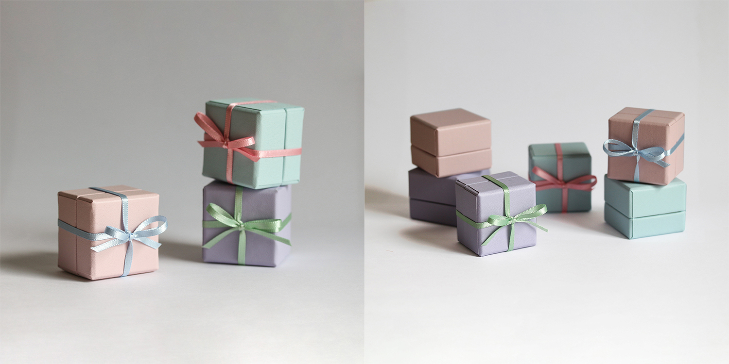 基本的にピアス、リングは丸のBOX、ネックレスは長方形のBOXでラッピングをさせて頂きます。